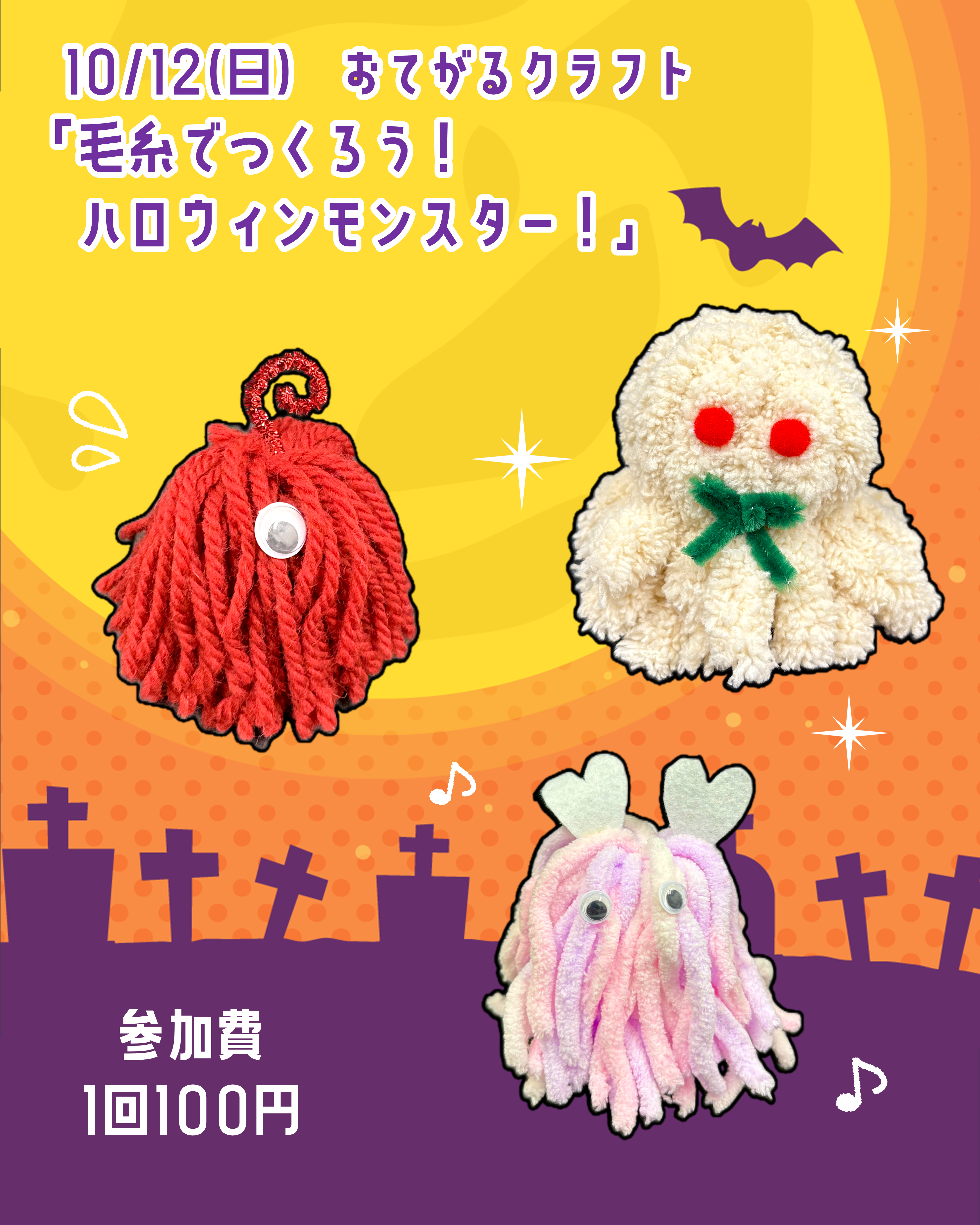 内容:毛糸をぐるぐる巻いて目や触手を付けて、可愛いハロウィンモンスターを作りましょう!